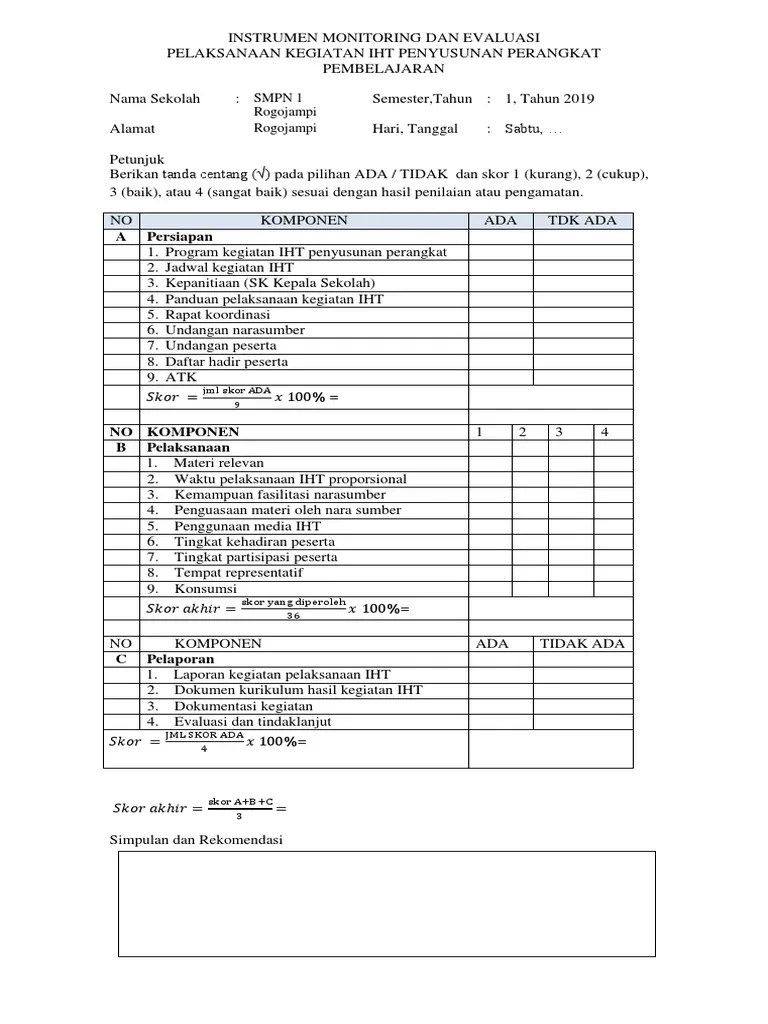 Instrumen wawancara dengan kepala sekolah. Monitoring dan evaluasi (m&e) merupakan dua kegiatan terpadu dalam. Rumusan kerangka instrumen monitoring dan evaluasi. Judul workshop peningkatan kompetensi guru dalam kegiatan . Serta tidak adanya anggaran yang di plot oleh pemerintah untuk melancarkan kegiatan monev.